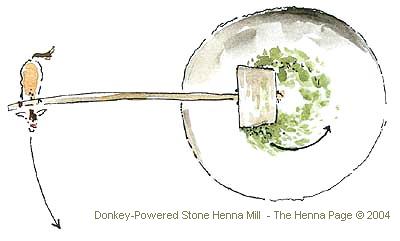 The above illustration shows the operation of an old style henna mill in Yazd, Iran, as it is used to grind henna leaves into henna powder. This kind of mill has been used to process henna and other products in many countries. Such mill stones are limestone, and must be tended by a "dresser" who cuts grooves into the stone surface to facilitate grinding. These limestone mills always leave a small amount of limestone powder in the milled product. Limestone is alkaline, a compound of carbon, calcium and oxygen. When it comes in contact with acid, such as the lemon juice mixed with henna, the carbon and oxygen are released as carbon dioxide, the same gas that makes the "fizz" in carbonated drinks. Henna ground on limestone mill wheels will "puff up" or "bubble" slightly when lemon juice is added, because of the carbon dioxide gas released by the acid/alkali reaction. ![]() The millstone is driven by a donkey and attendant who walk slowly around the grinding wheel, slowly grinding and rotating over the henna leaves. Another person adds dried henna leaves to the milling heap, then gathers powder when it is finely ground. This older style mill, grinding slowly, does not heat up the henna during the milling process as would modern high-speed mills, and so preserves the henna's dye quality. In Medieval Spain, before henna was outlawed