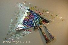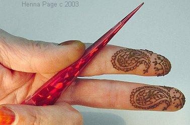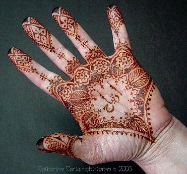 Get out your best pair of glasses, or use an embroiderer's desk magnifier unless you have wonderful, young eyesight. Many people purchase a pair of non-prescription reading (magnifying) glasses to help them do tiny patterns. Henna Page Artists do fine, delicate henna work with cones! Jewel, of Singapore, did this beautiful finger patterning with cellophane wrap cones! You can see more of her work on her website! Catherine Cartwright-Jones does fineline work with Mylar Holowrap cones. All text and images on this page unless otherwise cited copyright 2003 all rights reserved Catherine Cartwright-Jones The Henna Page