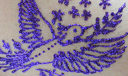 ![]() Sprinkle on gilding powder and brush or blow away the excess. If the weather is very humid, or if you are perspiring, you may need to rinse off excess glitter. Wait twenty minutes for the paste to dry before washing. You can wash away the excess glitter, gilding powder, or metallic powder with soap and water, washing will not disturb the pattern! |