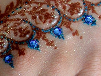 ![]() | Use gems on henna stains with gilding. Use flat backed crystal gems for body art. Use a skin-friendly waterproof medical adhesive to glue them to the skin. Choose the place where you want to have a gem. Put a tiny spot of Pros-Aide® Adhesive Original, Pros-Aide® Cream Adhesive or Becoming Moonlight® Gilding Paste onto the skin. ![]() Tap a gem with a birthday candle to pick it up and put it onto the dot of adhesive or gilding paste. It will stay in place until you rub or pick it off. |