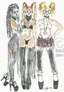 They don't walk about much on their 9" high heels, just enough to find shade so they can maintain their funerial palor. They like henna, if it doesn't interfere with the rest of their costume. Dragons and Celtic knotwork are their favorite hennaes, and we oblige. They also order up bats, "Carpe Noctem" and other mortuary-friendly patterns. Fastidious about dress, they appreciate and care for their henna! Marilyn Manson puts on a HELLUVA show! There didn't seem to be many guyz dressing the Marilyn Manson part, though some strode bravely along in eye makeup and fishnet tights, girlfriends leading them along with chains and choker collars. One fellow brought his girlfriend a rose to make up for an argument, and she broke catafalq character to kiss and hug him. These gurlz, at midnight after the show in Columbus, were trying to convince the guards that they had special invitations to spend the night with the band. The band busses, however, had sped out of the parking lot an hour earlier to the next gig in Connecticut. |